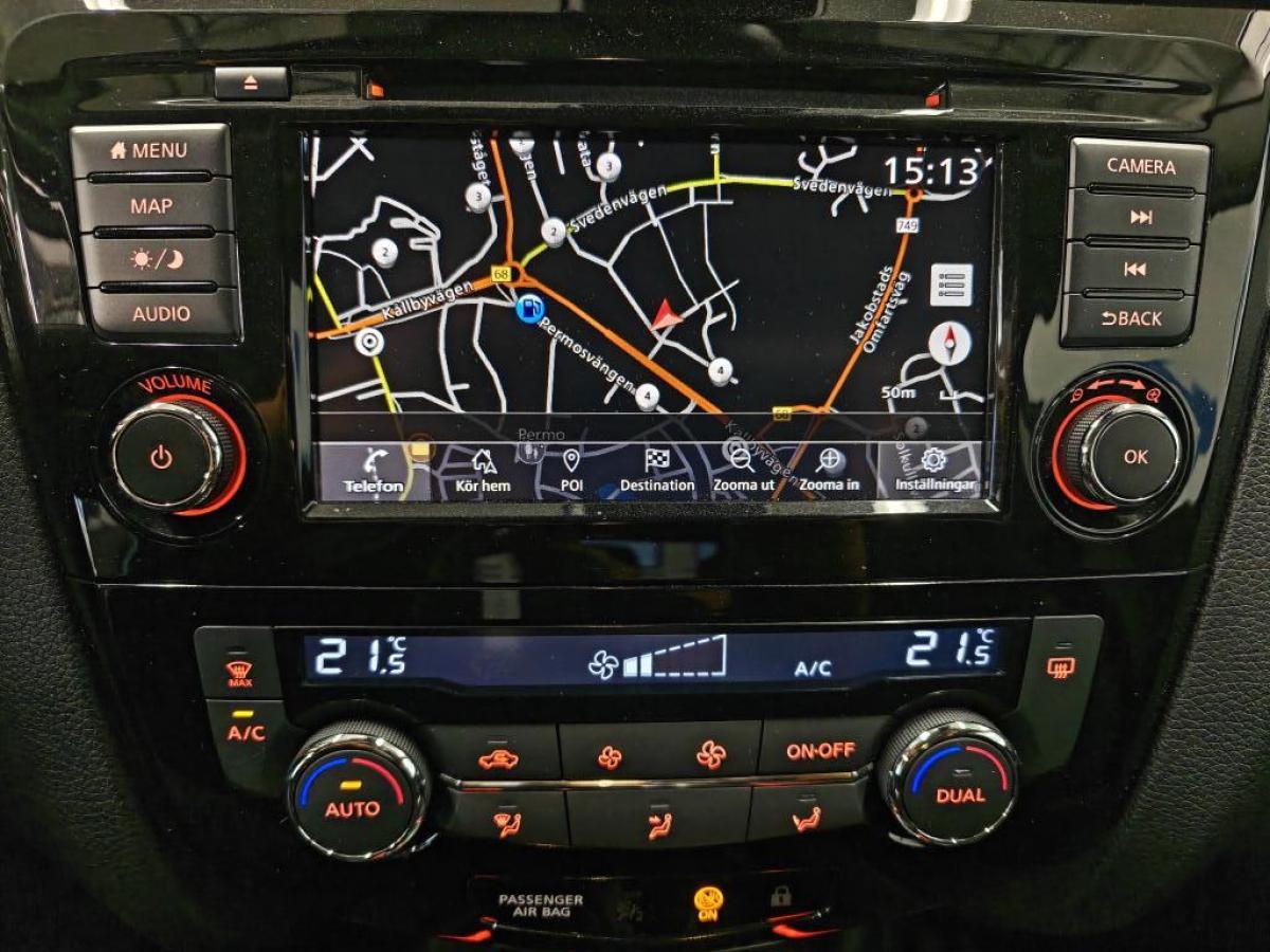 Integroitu NissanConnect-navigointi- ja -audiojärjestelmä (DAB),Around View Monitor -kamerajärjestelmä,Etu- ja takapysäköintitutka,Peruutuskamera,Aktiivinen pidonhallinta,ESP-ajovakaudenhallintajärjestelmä,Automaattinen ilmastointi kaksivyöhykkeisellä säädöllä,Stop/Start -järjestelmä,Etumatkustajan istuimen manuaalinen korkeussäätö,Etumatkustajan istuimen manuaalinen ristiselän tuen säätö,Kaksi ISOFIX-lastenistuimen kiinnityskohtaa takaistuimissa,Kuljettajan istuimen korkeussäätö,Kuljettajan istuimen manuaalinen ristiselän tuen säätö,Lämmitettävät etuistuimet,Premium-istuimet kangasverhoilulla,Suhteessa 60:40 jaettu taittuva takaistuin,Takana keskellä kyynärnoja (ja 2 mukitelinettä),Vakionopeudensäädin ja nopeudenrajoitin,Ajotietokone,sadetunnistin,Sähkötoimiset kauko-ohjattavat etu- ja takaikkunat, kuljettajan ikkunassa impulssikytkin,Takalasin pyyhkimessä tihkutoiminto ja automaattinen pyyhintä peruutettaessa,Tummennetut lasit takaikkunassa ja takasivuikkunassa,Tuulilasinpyyhkijät, joissa on ajonopeuden mukaan säätyvä tihkutoiminto,6 turvatyynyä (kuljettajan, etumatkustajan ja sivuturvatyynyt sekä ikkunaturvaverhot), poiskytkettävä etumatkustajan turvatyyny,ABS-jarrut, hätäjarrutustehostin ja EBD,Sähköinen käsijarru,Korinväriset peilinkuoret,Lämmitettävät, sähkötoimiset ja automaattisesti taittuvat sivupeilit,Ohjauspyörän kallistus ja teleskooppinen säätö,D-kirjaimen muotoinen nahkaverhoiltu ohjauspyörä ja vaihteenvalitsimen nuppi,Ajoasetuksen valinta (Normal / Sport),Apple CarPlay® Liitäntä,Haineväantenni,Matkapuhelimen hands free -toiminto Bluetooth-yhteyden avulla,MP3-yhteensopiva CD-soitin,USB-liitäntä ja iPod-yhteys,USB-pistokkeet 2. istuinriville,5" värillinen Advanced Drive - Assist Display (ADAD) -näyttö,7" kosketusnäyttö, AM/FM, MP3/AUX/ Bluetooth®,AUX-liitäntä,Yhden levyn AM/FM CD-soitin ja 6 kaiutinta,Takaovien lapsilukot