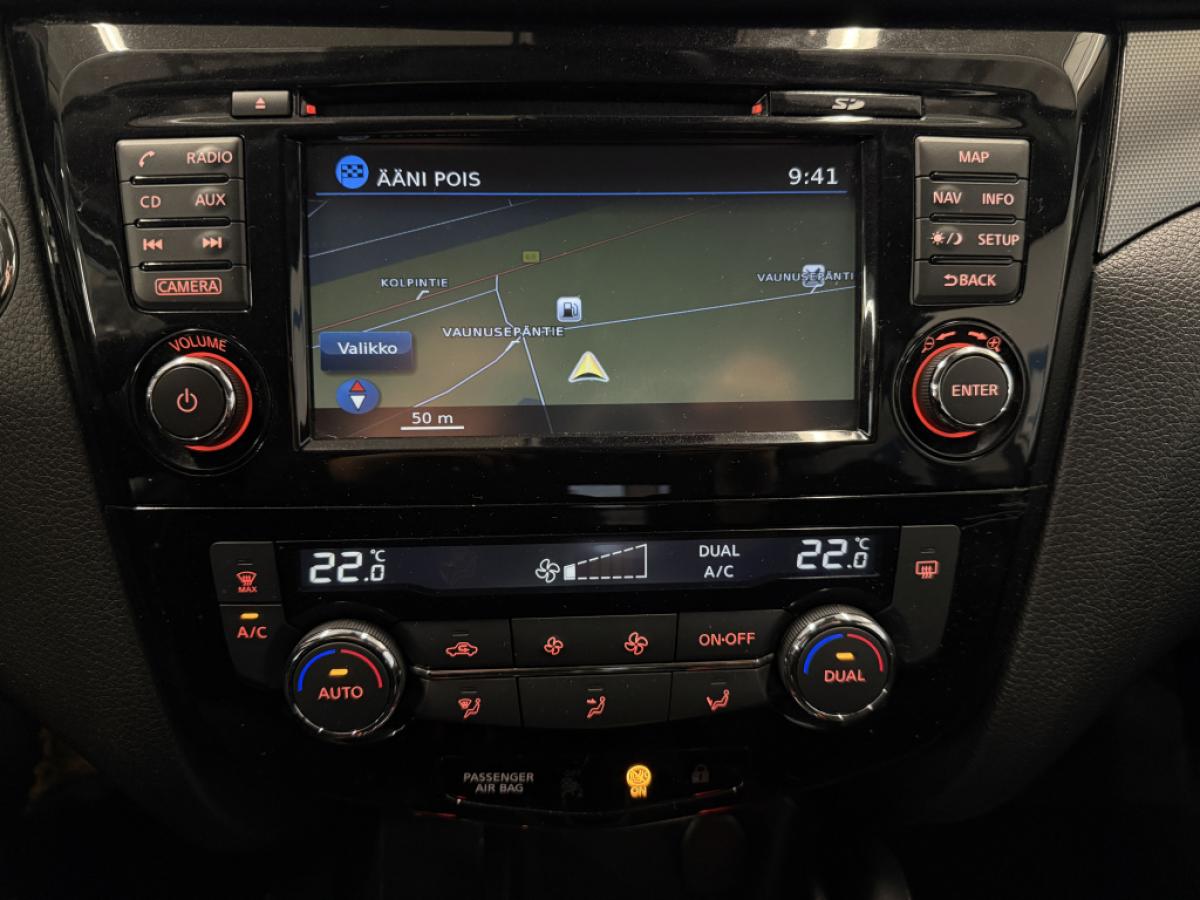 Integroitu NissanConnect-navigointi- ja -audiojärjestelmä (DAB),Around View Monitor -kamerajärjestelmä,Etu- ja takapysäköintitutka,Peruutuskamera, 7" värillinen LCD-näyttö ja NissanConnect,Aktiivinen pidonhallinta,ESP-ajovakaudenhallintajärjestelmä,Automaattinen ilmastointi kaksivyöhykkeisellä säädöllä,Stop/Start -järjestelmä,Etumatkustajan istuimen manuaalinen korkeussäätö,Etumatkustajan istuimen manuaalinen ristiselän tuen säätö,Kaksi ISOFIX-lastenistuimen kiinnityskohtaa takaistuimissa,Kuljettajan istuimen korkeussäätö,Kuljettajan istuimen manuaalinen ristiselän tuen säätö,Lämmitettävät etuistuimet,Premium-istuimet kangasverhoilulla,Suhteessa 60:40 jaettu taittuva takaistuin,Takana keskellä kyynärnoja (ja 2 mukitelinettä),Vakionopeudensäädin ja nopeudenrajoitin,Ajotietokone,sadetunnistin,Sähkötoimiset kauko-ohjattavat etu- ja takaikkunat, kuljettajan ikkunassa impulssikytkin,Takalasin pyyhkimessä tihkutoiminto ja automaattinen pyyhintä peruutettaessa,Tummennetut lasit takaikkunassa ja takasivuikkunassa,Tuulilasinpyyhkijät, joissa on ajonopeuden mukaan säätyvä tihkutoiminto,6 turvatyynyä (kuljettajan, etumatkustajan ja sivuturvatyynyt sekä ikkunaturvaverhot), poiskytkettävä etumatkustajan turvatyyny,ABS-jarrut, hätäjarrutustehostin ja EBD,Aktiivinen moottorijarrutus,Mäkilähtöavustin,Sähköinen käsijarru,Ohjauspyörän kallistus ja teleskooppinen säätö,D-kirjaimen muotoinen nahkaverhoiltu ohjauspyörä ja vaihteenvalitsimen nuppi,Ajoasetuksen valinta (Normal / Sport),Haineväantenni,Matkapuhelimen hands free -toiminto Bluetooth-yhteyden avulla,MP3-yhteensopiva CD-soitin,USB-liitäntä ja iPod-yhteys,5" värillinen Advanced Drive - Assist Display (ADAD) -näyttö,AUX-liitäntä,Takaovien lapsilukot